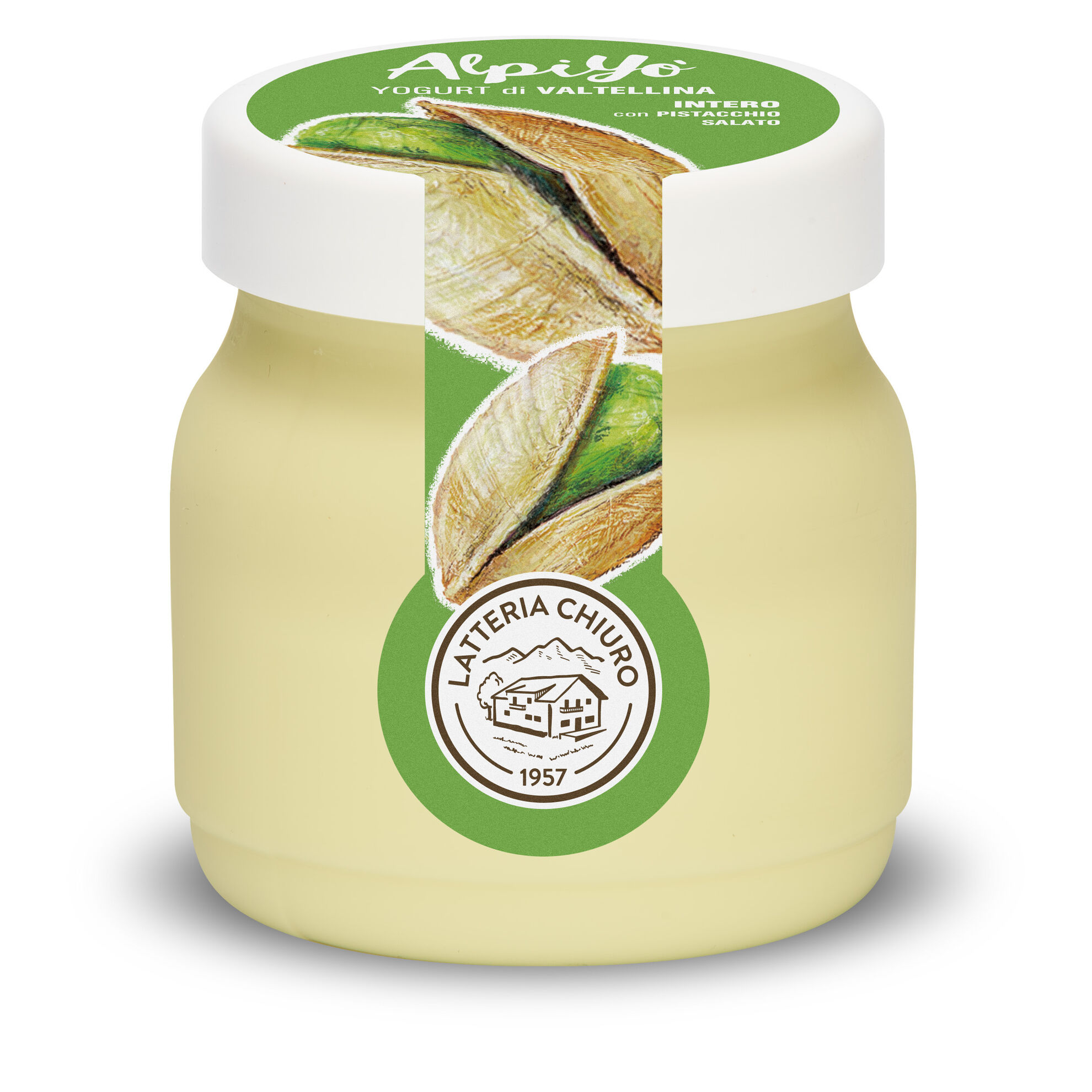 Yogurt (latte fresco pastorizzato intero della Valtellina, fermenti lattici vivi), preparato al pistacchio salato 16 % (zucchero, olio di girasole, maltodestrine, pistacchi 0,96 % sul prodotto finito, latte magro in polvere, sale 0,11 % sul prodotto finito, zucchero caramellizzato, emulsionante: lecitina di soia; aromi, coloranti: complessi rameici delle clorofille, curcumina). L’immagine ha il solo scopo di rappresentare il prodotto.