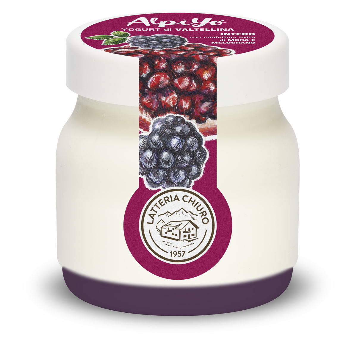 Yogurt (latte fresco pastorizzato intero della Valtellina, fermenti lattici vivi), confettura di mora e melograno 16% (zucchero, purea di more 5.6% sul prodotto finito, succo di melograno 1.6% sul prodotto finito, sciroppo di glucosio, gelificante: pectina; acidificante: acido citrico).